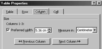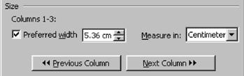 Se selecteaza Next Column sau Previous Column pentru a trece la schimbarea latimii altor coloane din tabel.