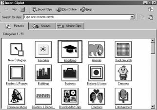 O imagine grafica este o fotografie pastrata pe disc intr-un fisier de grafica. Word poate utiliza fisiere grafice create cu o mare varietate de aplicatii (Lotus 1-2-3, metafisiere Windows, Micrografx, Designer, AutoCAD, Paintbrush etc.). In plus, programul Word include o mica biblioteca de imagini grafice fig421 (grupate pe categorii: Academic, Animals, Communications, Business, Emotions, Industry etc), care se poate folosi in documente.