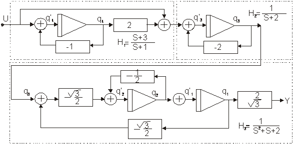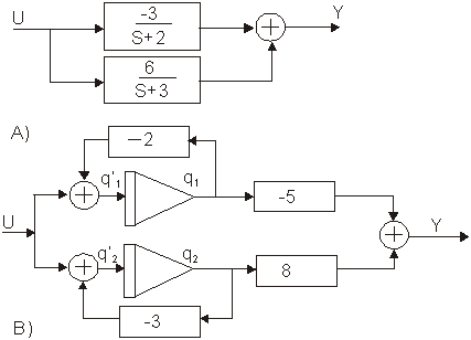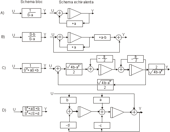 3.Elementele schemei bloc astfel obtinute se înlocuiesc cu conexiuni echivalente realizate cu elemente sumatoare, integratoare si de înmultire.