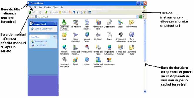 Identificarea diferitelor componente ale unei ferestre: bara de titlu, bara de meniuri, bara de 252i89c instrumente, bara de derulare
