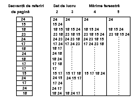 Figura 12.1 descrie o secventa de referiri de pagina pe care o poate face procesul, ilustrând setul de lucru pentru diferite marimi ale ferestrei si urmând politica de înlocuire a paginii celei mai putin folosite recent. Pe timpul executiei procesului, setul sau de lucru se schimba, in functie de secventa de referinte de memorie pe care acesta o executa; o dimensiune mai mare a ferestrei presupune un set de lucru mai mare, implicând faptul ca procesul nu se va mai întrerupe asa des. Nu este practic sa se implementeze un model de set de lucru pur, deoarece este foarte greu sa se retina ordinea referirilor de pagina.