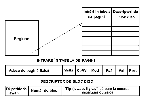 Asa cum s-a aratat in capitolul 7 o regiune contine tabele de pagini pentru a accesa memoria fizica. Fiecare intrare a unei tabele de pagini (Figura 12.2)contine adresa fizica a paginii, bitii de protectie care indica daca procesul poate citi, scrie sau executa pagina si urmatoarele câmpuri de biti pentru asigurarea paginarii la cerere: