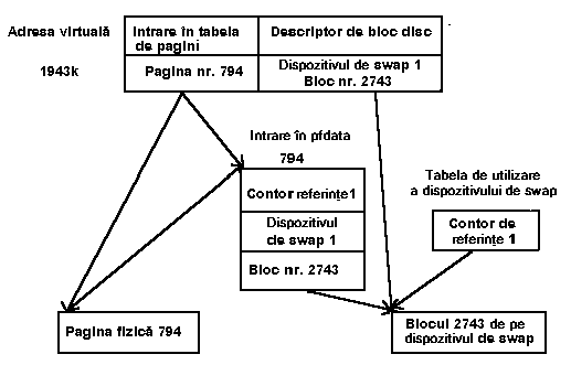 Figura 12.3 ilustreaza relatiile existente intre intrarile in tabela de pagini, descriptorii de bloc disc, intrarile din tabela pfdata si tabela de folosire a dispozitivului de swap. Adresa virtuala 1493k a procesului este mapata intr-o intrare din tabela de pagini care pointeaza catre pagina fizica 794; descriptorul de bloc disc pentru intrarea din tabela de pagini arata ca exista o copie a paginii pe blocul disc 2743 de pe dispozitivul de swap 1. Intrarea in tabela pfdata pentru pagina fizica 794 arata, de asemenea, ca o copie a paginii exista pe blocul disc 2743 de pe dispozitivul de swap 1 iar contorul sau de referinte din memoria interna este 1. Contorul tabelei de folosire a dispozitivului de swap pentru pagina virtuala este 1, însemnând ca o singura intrare din tabela de pagini printeaza catre copia de pe dispozitivul de swap.