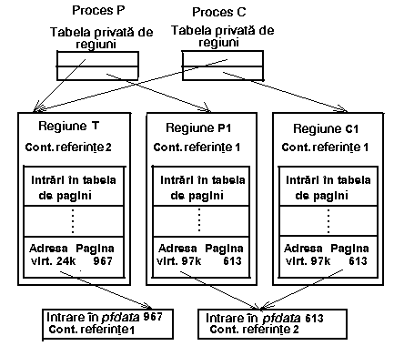 Figura 12.4 prezinta structurile de date atunci când un proces executa apelul sistem fork. Procesele isi împart accesul la tabela de pagini a regiunii de text T folosita in comun, astfel încât contorul de referinte al regiunii este 2 si contorul de referinte al tabelei pfdata pentru paginile din regiunea de text este 1. Nucleul aloca o noua regiune de date pentru procesul fiu, C1, copie a regiunii P1 din procesul parinte. Intrarile din tabela de pagini ale celor doua regiuni sunt identice, asa cum este ilustrat de intrarea pentru adresa virtuala 97.