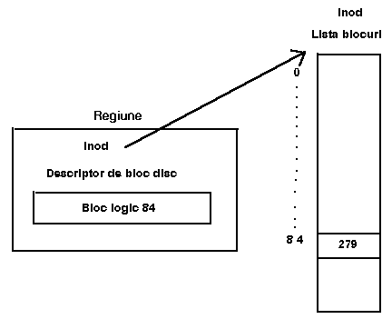 Când seteaza tabelele de pagini pentru un astfel de fisier executabil, nucleul marcheaza descriptorul de bloc disc cu numarul blocului logic (pornind de la blocul 0 din fisier ) care contine pagina; rutina de tratare a întreruperii de validitate foloseste aceasta informatie mai târziu pentru a încarca pagina din fisier. Figura 12.6 prezinta un aranjament tipic, in care descriptorul de bloc disc indica faptul ca pagina se gaseste la deplasamentul de bloc logic 84 in fisier. Nucleul urmareste pointerul de la regiune catre inod si gaseste numarul blocului disc corespunzator (279).