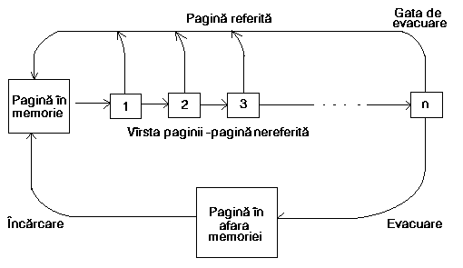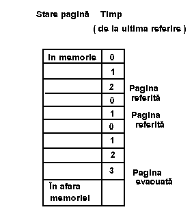 Figura 12.8 prezinta interactiunea dintre procesele care acceseaza o pagina de catre procese si examinarile facute de procesul page stealer. Se pleaca de la pagina încarcata in memorie, figura ilustrând numarul de examinari ale procesului page stealer intre referirile la memorie. Un proces a referit pagina dupa a doua examinare, scazând astfel vârsta aceteia la 0. In mod similar, un proces a referit din nou pagina dupa inca o examinare. In sfarsit, procesul page stealer examineaza pagina de trei ori fara sa intervina vreo referire si evacueaza pagina.