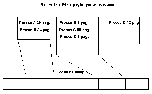 De exemplu, sa presupunem ca procesul page stealer evacueaza 30, 40, 50 si 20 de pagini din procesele A, B, C si respectiv D, si ca scrie 64 de pagini pe dispozitivul de swap intr-o operatie de scriere pe disc. Figura 12.9 prezinta secventa operatiilor de evacuare a paginilor care ar aparea daca programul page stealer ar examina paginile proceselor in ordinea A,B,C si D. Procesul page stealer aloca spatiu pentru 64 de pagini pe dispozitivul de swap si evacueaza 30 de pagini ale procesului A si 34 de pagini ale procesului B. Aloca apoi spatiu pe dispozitivul de swap pentru alte 64 de pagini si evacueaza cele 6 pagini ramase de la procesul B, 50 de pagini ale procesului C si 8 pagini ale procesului D. Cele doua zone de pe dispozitivul de swap pentru cele doua operatii de evacuare nu trebuie sa fie contigue. Procesul page stealer pastreaza cele 12 pagini ramase ale procesului D intr-o lista a paginilor ce trebuiesc evacuate, dar nu le va evacua pâna când lista nu se umple.