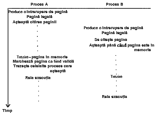 In mod similar, rutina de tratare a întreruperii nu trebuie sa citeasca pagina in memorie daca alt proces a generat o întrerupere pentru aceeasi pagina, dar nu a terminat inca încarcarea acesteia in memorie. Rutina de tratare gaseste blocata regiunea care contine intrarea in tabela de pagini ca urmare a unei alte instante a rutinei de tratare a întreruperii. De aceea, se pune in asteptare pâna la terminarea celelalte instante a rutinei, gaseste pagina valida si se termina. Un astfel de scenariu este ilustrat in figura 12.13.