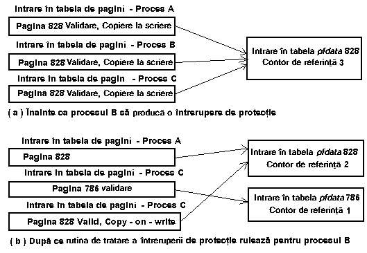 Rutina de tratare a întreruperii de protectie aloca pagina 786, copiaza continutul paginii 828 in noua pagina, decrementeaza contorul de referinte al paginii 828 si actualizeaza intrarea din tabela de pagini accesata de procesul B sa pointeze catre pagina 786.