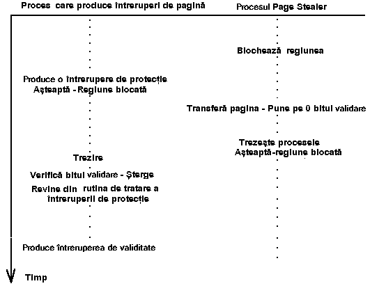 Daca intrarea din tabela de pagini este invalida si bitul sau " copiere la scriere este setat pentru a produce o întrerupere de protectie, sa presupunem ca sistemul trateaza mai întâi întreruperea de validitate când un proces acceseaza pagina. Cu toate acestea, rutina de tratare a întreruperii de protectie trebuie sa verifice daca pagina mai este valida, deoarece ea s-ar putea pune in asteptare cât timp regiunea este blocata iar procesul page stealer ar putea evacua, intre timp, pagina din memorie. Daca pagina nu este valida, rutina de tratare se termina imediat, iar procesul va produce din nou o întrerupere de validitate.