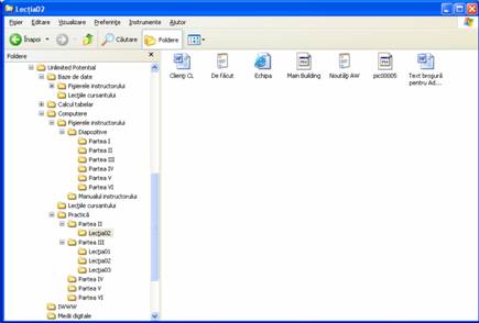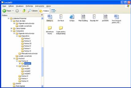 6 Faceti clic pe folderul Practica Computere - Notiuni de baza, apoi pe Partea II si in sfarsit pe Lectia02. Fisierele de practica apar in panoul din dreapta al ferestrei.
