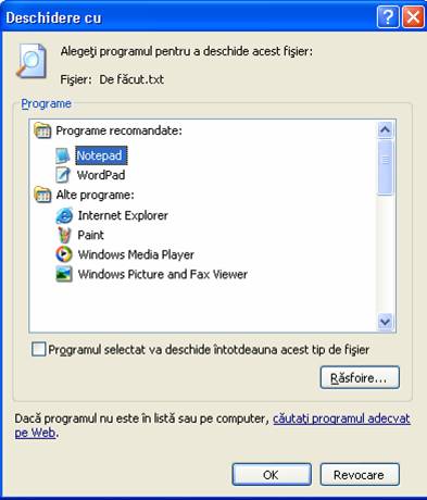 In acest exercitiu, veti deschide un fisier utilizand programul implicit asociat lui. Apoi veti alege un program pentru a-l utiliza la deschiderea unui fisier.