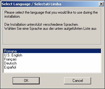 In prima fereastra de dialog veti fi solicitat limba in care doriti sa se efectueze restul instalarii. Nu are importanta in ce limba se face instalarea, interfata programului fiind in mai multe limbi: romana, engleza, franceza, germana, spaniola, portugheza, rusa. Astfel, daca alegeti pentru instalare limba franceza nu inseamna ca meniurile programului vor fi in limba franceza, ci doar mesajele din timpul instalarii vor fi afisate in limba franceza.