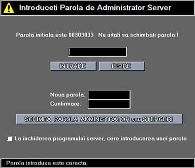Nu uitati ca de fiecare data cand efectuati unele modificari in setarile programului, sa nu uitati parola de administrator introdusa, pentru ca dupa plecarea dvs. operatorii sa nu aiba acces la setarile de baza ale programului Server. Pentru acest lucru, apasati butonul "IESIRE" dupa ce ati terminat. O a treia (si ultima !) parola in programul Server poate fi stabilita daca activati optiunea "La inchiderea programului server, cere introducerea unei parole". Aceasta optiune nu mai permite inchiderea programului Server, decat cu o parola. Astfel, operatorii nu vor putea opri functionarea programului server decat daca au aceasta parola (sau prin Task Manager-ul Windows-ului daca au acces). Oprirea programului Server nu este un lucru grav, uneori fiind nevoie de acest lucru pentru a se reseta calculatorul dupa mai multe zile de functionare. In acest timp in care serverul nu este prezent, contorizarea se va memora pe statiile de lucru, la repornirea serverului facandu-se resincronizarea si continuand normal contorizarea.