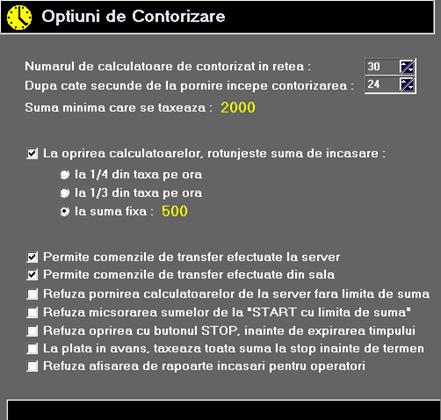 In primul rand, trebuie sa completati numarul de calculatoare (statii de lucru) pe care programul Server le va controla, in sala dvs. Este posibil sa stabiliti deasemeni o "perioada de gratie" dupa care incepe contorizarea. Astfel, daca operatorul apasa din greseala butonul "START" din dreptul calculatorului 3, sa poata reveni si apasa "STOP", fara sa se taxeze nimic. O perioada de 15-20 secunde este suficienta. Puteti stabili deasemeni o suma minima care trebuie incasata, indiferent cat de putin sta un client la calculator. Pentru a nu va complica cu restul care trebuie dat clientilor, puteti alege una din optiunile de rotunjire a sumei taxate. Daca de exemplu alegeti "la suma fixa: 1000 lei", in cazul in care un client are de platit 13.250 lei la oprire, suma i se va rotunji automat la 14.000 lei