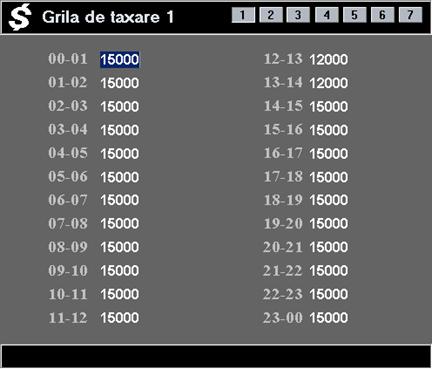 Fiecarei casute ii corespunde un interval orar care poate fi contorizat diferit, in functie de suma completata. Astfel, este posibil de exemplu ca intre ora 14 si 15 tariful sa fie de 15.000 lei/ora, iar intre 15 si 16 tariful sa fie de 20.000 lei/ora. Pentru o utilizare normala, trebuie completata numai grila de taxare 1. In cazul in care doriti sa aveti tarife diferite pentru categorii diferite de programe (de ex. Internet 20.000, Jocuri 15.000) trebuie sa completati si o a doua sau a treia grila de taxare, dupa caz.