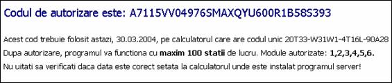 Alegeti si versiunea de program pe care o folositi, apoi apasati butonul "GENEREAZA COD". In mod normal ar trebui ca site-ul sa va returneze un cod de autorizare, ca in figura de mai jos: