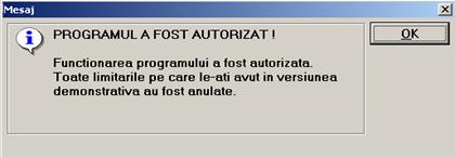 Repetati procedura "COD DE AUTORIZARE" si de data aceasta codul de autorizare ar trebui sa mearga fara probleme. Introduceti codul de autorizare de pe site in programul Server, la rubrica "Codul de autorizare primit:" si apasati butonul "AUTORIZEAZA FUNCTIONAREA PROGRAMULUI". Trebuie sa apara la Server un mesaj care sa va anunte ca programul a fost autorizat: