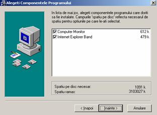 De-a lungul procesului de instalare, apasati butonul "Inainte" pentru a trece la urmatorul pas. In cea fereastra a 3-a aveti optiunea "Computer Monitor". Aceasata optiune va instala pe langa programul de contorizare un alt program auxiliar (invizibil pentru utilizator) care va inregistra activitatea Windows-ului, optiune utila atunci cand veti dori de la Server sa vedeti de exemplu perioadele cand calculatorul a fost oprit (scos din priza) sau nu. O alta optiune de instalare, "Internet Explorer Band" va instala in Internet Explorer o bara cu shortcut-uri spre interfata grafica a Clientului (butoanele 'Cat aveti de platit "Cereti suport tehnic", etc). Recomandat este sa lasati ambele optiuni marcate (cu semnul V).