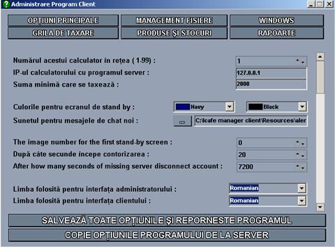 Odata programul Client instalat, mai trebuie sa pierdeti cateva secunde pentru o configurare sumara a acestuia. Imediat dupa instalare se va deschide consola de administrare a programului client (accesibila si ulterior), unde va trebui sa introduceti in principiu doar 2 setari: 1.IP-ul de retea al calculatorului unde este instalat programul Server si 2.Numarul pe care-l are in reteaua dvs. calculatorul unde tocmai s-a instalat programul Client (1,2,15,etc.)