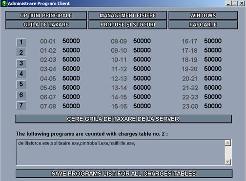 Apasati butonul "CERE GRILA DE TAXARE DE LA SERVER". Dupa aceasta actiune ar trebui sa apara in mod corect tarifele pe care le-ati stabilit anterior la programul Server. Observati ca in josul grilelor de taxare 2 ...7 puteti stabili o lista cu programele care vor trebui contorizate cu respectiva grila. Daca in dreptul grilei de taxare nr. 2 de exemplu introduceti "notepad.exe,solitaire.exe," aceste 2 programe vor fi taxate cu tariful din grila de taxare 2, daca acesta este mai mare decat cel din grila de taxare 1.