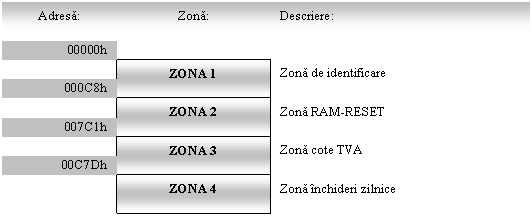 Memoria fiscala este organizata în 4 zone distincte, care sunt scrise si accesate separat in timpul functionarii imprimantei, dar care interactioneaza unele cu altele.