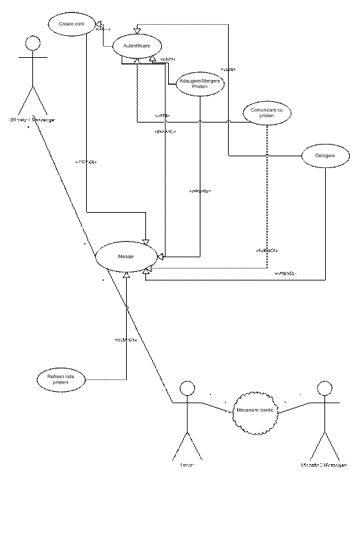 - trimite (Mesaj, entitate) - primeste (entitate) - createAccount (userName: String, pass: String) - login (userName:String, pass:String) - addFriend (user:Client) - deleteFriend (user:Client) - logout (userName:String) - comunica (user:Client) |