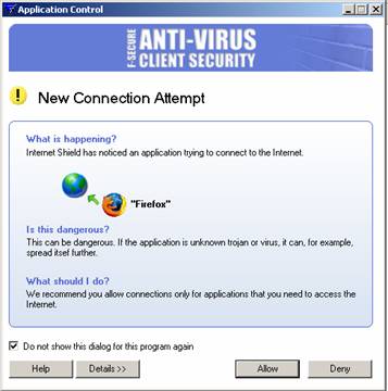 Ø Atenție! Este posibil ca F-Secure să vă ceară acordul pentru rularea unei aplicații (Application Control), ca de exemplu, în cazul de față, browser-ul Mozilla: