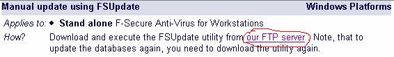 Fișierul de update se gasește la adresa : ftp://ftp.f-secure.com/anti-virus/updates/fsupdate.exe. Adresa poate suferi schimbări.Dacă fișierul nu se mai gasește aici, browsați siteul și executați pașii urmatori: