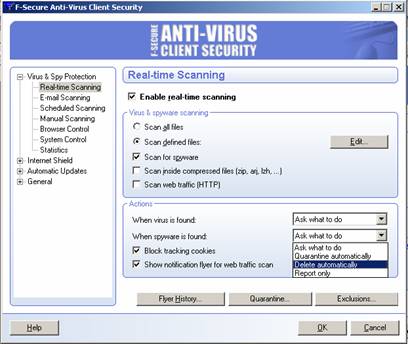 Selectăm din stânga "Virus&Spy Protection" și apoi din dreapta la Real-time Scanning, selectăm Configure....Va apărea următoarea fereastră: