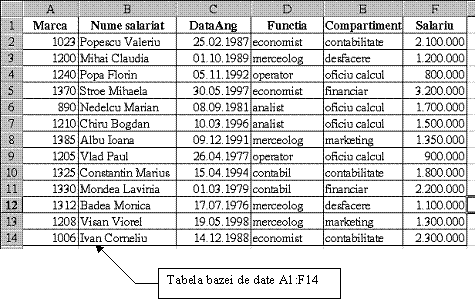 Plecand de la o baza de date pentru evidenta personalului unei societati comerciale, se calculeaza suma salariilor pe compartimente functionale. Tabelul ce contine baza de date va fi definit pe coordonatele A1:F14, figura 1.122.