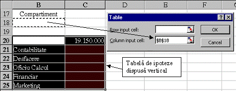 se activeaza comanda Data Table si in caseta Table se completeaza adresa celulei care contine criteriul in rubrica Column Input Cell- tabela de ipoteze fiind orientata in acest caz pe coloana ( in cazul organizarii tabelei pe linie.)