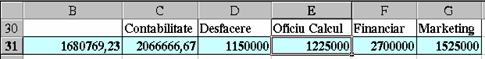 se introduce formula de insumare =SUM(A3:E15;5;B30:C31) in coltul superior stang al tabelei de ipoteze (la adresa B35). Formula va genera rezultate centralizate pentru fiecare functie si compartiment in parte;