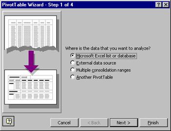 In prima etapa Pivot Table Wizard -Step 1 of 4 (figura 1.135) se alege sursa de date pentru sintetizarea informatiei: