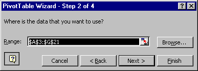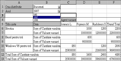 Un exemplu edificator de construire si utilizare a tabelei pivot ar consta in sintetizarea informatiei pentru o editura, referitoare la vanzarile de carte;Fie o tabela (figura 1.134) aferenta unei baze de date care regrupeaza informatii referitoare la vanzarile de carte de informatica pe orase (Bucuresti, Ploiesti, Bacau, Iasi), pe doi ani (1997/1998), pe agenti de vanzare (Radulescu S, Ionescu L, Popescu M, Vasilescu D, Moisescu A.), pe cantitati vandute (fiecare carte poate fi vanduta in mai multe orase si acelasi agent de vanzare poate opera vanzari pentru un titlu de carte sau mai multe, in acelasi oras sau in mai multe) si pe valori reiesite din vanzari. Pretul cartii se poate extrage (cu functia VLOOKUP) dintr-un tablou de consultare verticala. Volumul vanzarilor realizate de catre fiecare agent de vanzare este rezultatul inmultirii cantitatii vandute cu pretul cartilor. In rezolvarea aplicatiei, asistentul tabelei pivot (prin comanda Data - Pivot Table Report) parcurge urmatoarele patru etape (prin apasarea butonului Next> pentru fiecare etapa in parte):