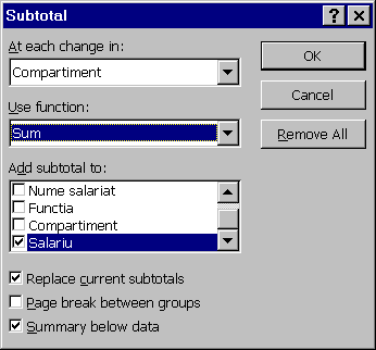 se precizeaza rubrica pentru care se face gruparea. Astfel, din lista derulanta At Each Change in (in cazul de fata) se alege rubrica pe care se face gruparea sau unde are loc "ruptura de secventa" 'Compartiment';