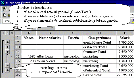 Sub Excel exista posibilitatea sintetizarii informatiei prin organizarea ei pe niveluri de grupare, iar apoi pot opera diferite calcule pe aceste grupuri sau informatii centralizate. Altfel spus Excel poate organiza datele prin grupare pentru generarea de totaluri si subtotaluri.