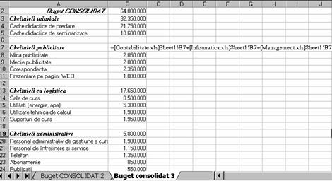 Astfel de exemplu daca cele trei bugete ar fi fost construite pe fisiere separate: Contabilitate.XLS, Informatica.XLS, Management. XLS, formula de consolidare a datelor pentru Cheltulielile publicitare (celula B7) ar fi :