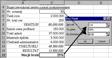 se stabileste ce valoare sa se schimbe in rubrica By changing cell: (celula C5) - in cazul prezentat numarul de cursanti- pentru a se ajunge la obiectivul propus;