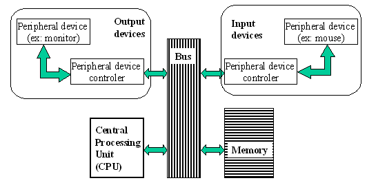 Conform figurii se poate constata ca fiecare componenta (ex. monitorul) comunica cu magistrala de comunicatie prin intermediul unui controlor specific componentei (în cazul monitorului controlerul se numeste placa video - video card).