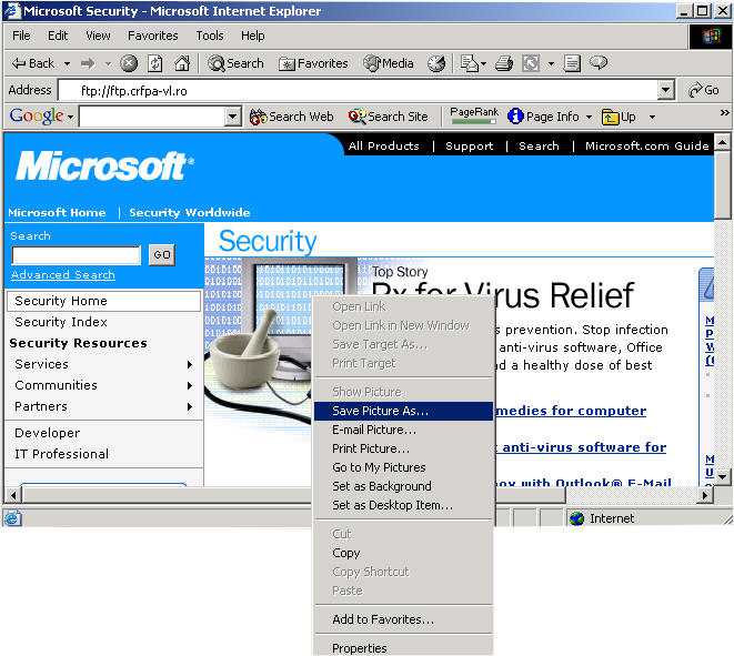 O alta metoda de a captura o imagine mica este sa executam clic dreapta pe imagine, apoi executam clic pe Copy īn meniul rapid care apare. Deschidem un fisier nou īntr-o aplicatie grafica, apoi alegem Edit, Paste sau clic dreapta īn spatiul liber al programului si alegem Paste din meniul rapid ce apare. Putem sa salvam imaginea īn orice format pe care programul nostru īl permite.