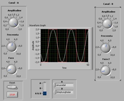 Programul trebuie sa contina butoane pentru modificarea amplitudinii, frecventei si fazei semnalelor, pentru fiecare din cele doua canale (A sau B). Sunt necesare butoane de selectia a canalelor (A, B sau A+B ) si de selectie a tipului semnalului (sinusoidal, dreptunghilar, triunghilar, dinte de fierastrau). Deasemenea mai sunt necesare butane de reset si de oprire a rularii programului.