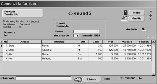 Presupunem c\ a]i comandat furnizorului "TEXTILA SA" `n ziua de 04.01.1999 urm\toarele articole (materii prime), la pre] de catalog: