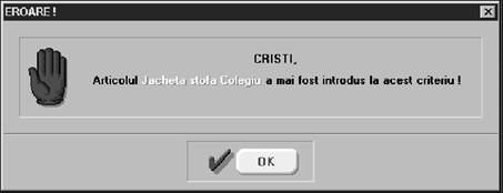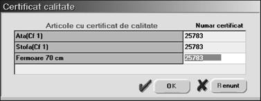 Pe ecran va fi afi[at\ fereastra din figura 5.1.2.3, `n care va trebui s\ introduce]i num\rul certificatului sau certificatelor de calitate care `nso]esc articolele primite. Dac\ nu vre]i s\ folosi]i aceast\ informa]ie, p\r\si]i macheta selectând butonul "RENUN}".