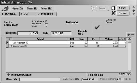 `nregistrarea facturii de import [i a DVI-ului `nso]itor, transmis de furnizorul extern "Gemini Trade"