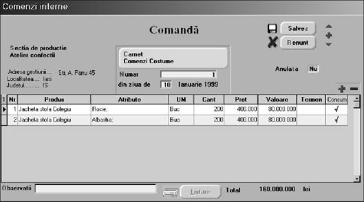 Urm\torul buton activat este "CARNET", `n care exist\ deja selectat carnetul de documente numit "COMANDA" furnizat odat\ cu programul. Pe parcursul programului vom observa c\, pentru aproape toate documentele firmei, se pot defini carnete de documente prin intermediul c\rora numerotarea lor se poate face automat. Este adev\rat c\ nimic nu ne `mpiedic\ s\ intervenim manual asupra num\rului atribuit `n mod automat, dar acest lucru se poate face doar `n limitele intervalului definit pentru carnetul respectiv [i al numerelor libere r\mase disponibile.
