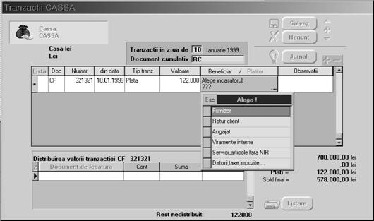 Accesa]i butonul "ALEGE ~NCASATORUL" [i selecta]i op]iunea "FURNIZOR". Din lista de alegere ce va fi afi[at\, selecta]i partenerul "GEMINI TRADE". Se va afi[a imediat lista obliga]iilor de plat\ corespunz\toare monezii contului `n care se face tranzac]ia - figura 5.4.2.2. Cu "CTRL+ " sau dublu click pe butonul s\geat\ dreapta, de deasupra grilei, selecta]i valoarea pl\]ii.