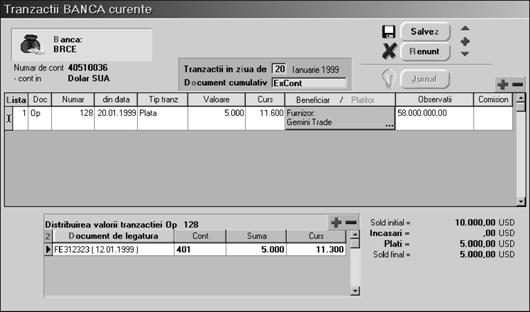 Continua]i introducând tipul documentului, num\rul, data este completat\ automat, tipul tranzac]iei (implicit "PLATA"), valoarea tranzac]iei (exprimat\ `n moneda contului) [i cursul monedei la data tranzac]iei. Se va afi[a automat `n câmpul "OBSERVA}II", valoarea tranzac]iei `n lei.