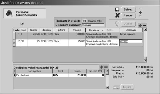 Deci s\ presupunem c\ Simion Alexandru, ca urmare a avansului `ncasat, eviden]iat cum am spus mai sus, prezint\ spre decontare, `n ziua de 10 ianuarie, `n urma unei delega]ii, ordinul de deplasare num\rul 25 pe baza c\ruia se calculeaz\ diurna `n valoare de 75.000 lei, pentru perioada deplas\rii [i un tichet de accelerat `n valoare de 340.000 lei.