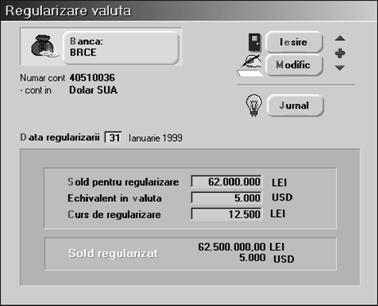 Programul solicit\ introducerea datei regulariz\rii [i a cursului de regularizare, oferind posibilitatea modific\rii echivalentului `n lei al soldului `n valut\ pentru cazul `n care, din diverse motive, datele din calculator nu coincid cu extrasul de regularizare al b\ncii.